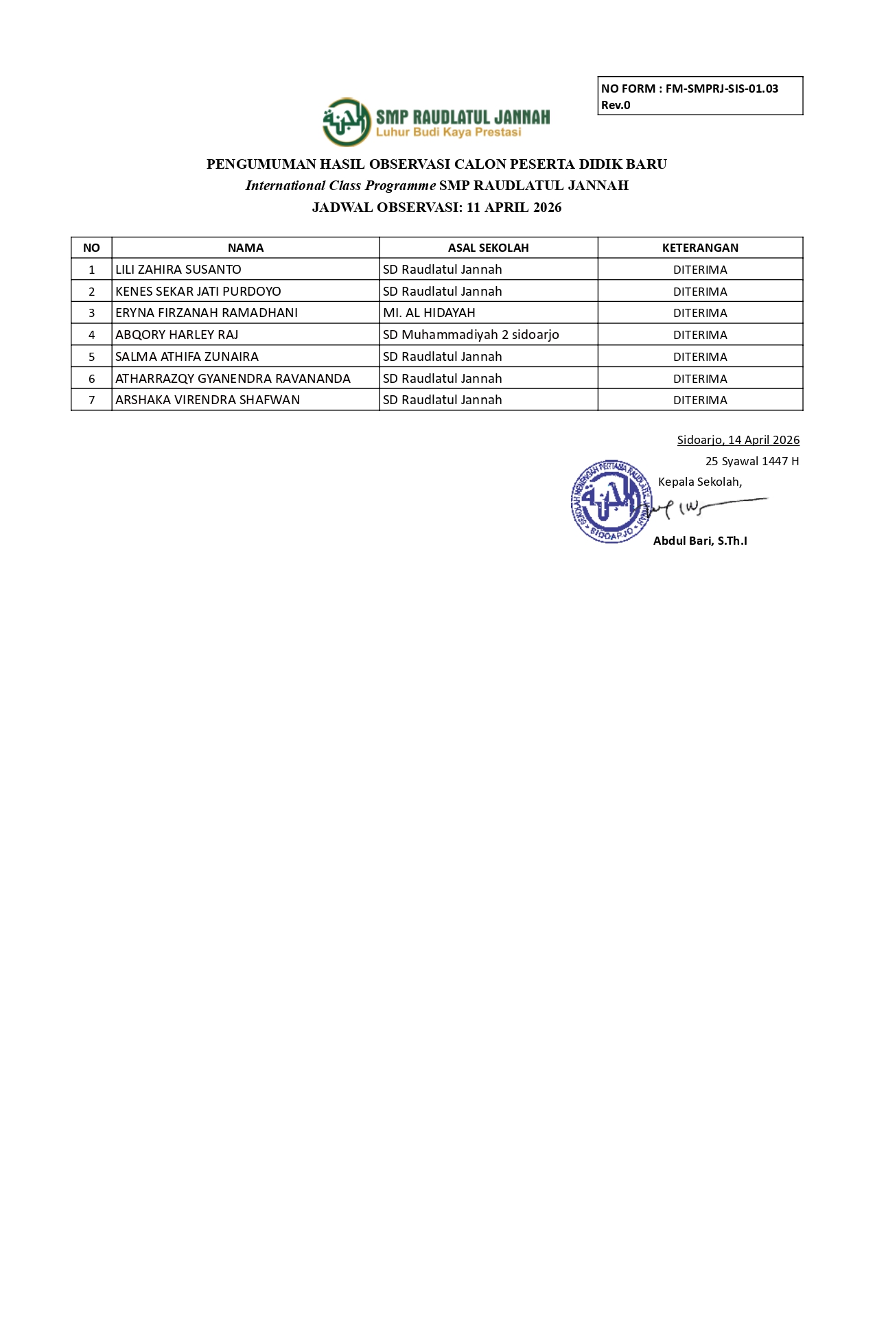 1. Bagi calon siswa yang telah diterima wajib menyelesaikan biaya daftar ulang sampai 14 Juni 2025.