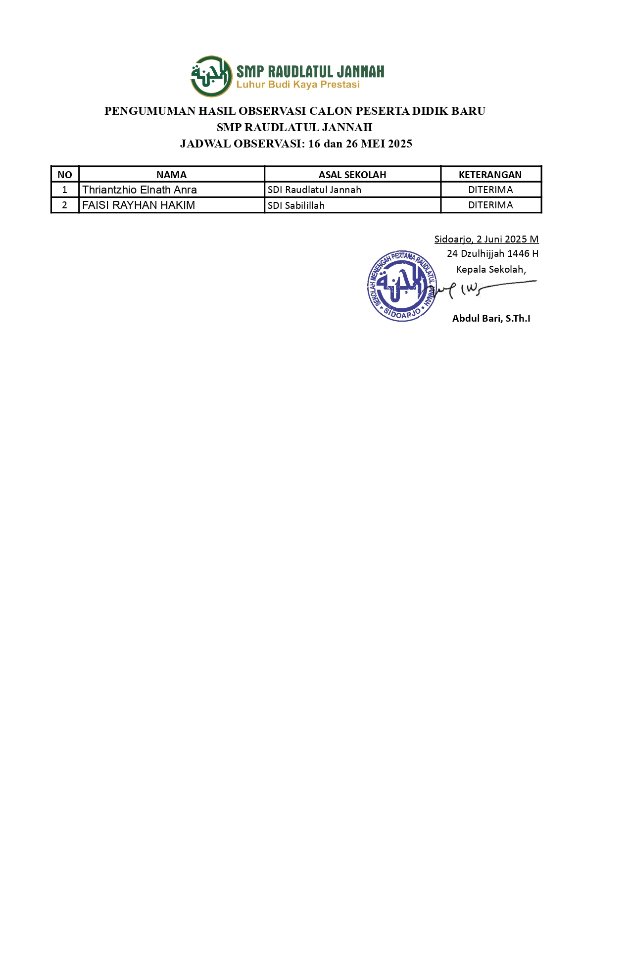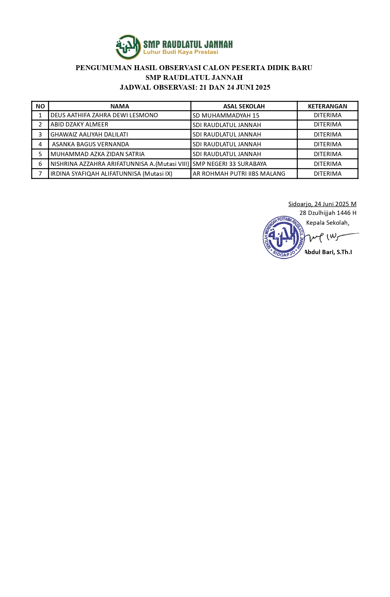 1. Bagi calon siswa yang telah diterima wajib menyelesaikan biaya daftar ulang sampai 07 Juni 2025.