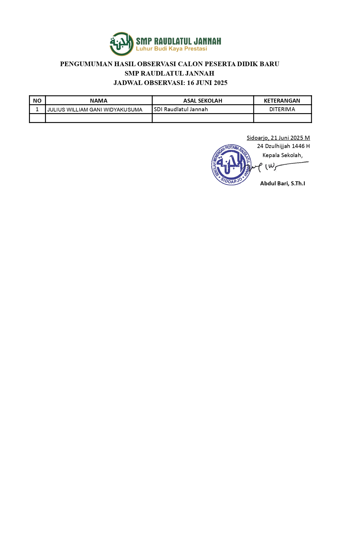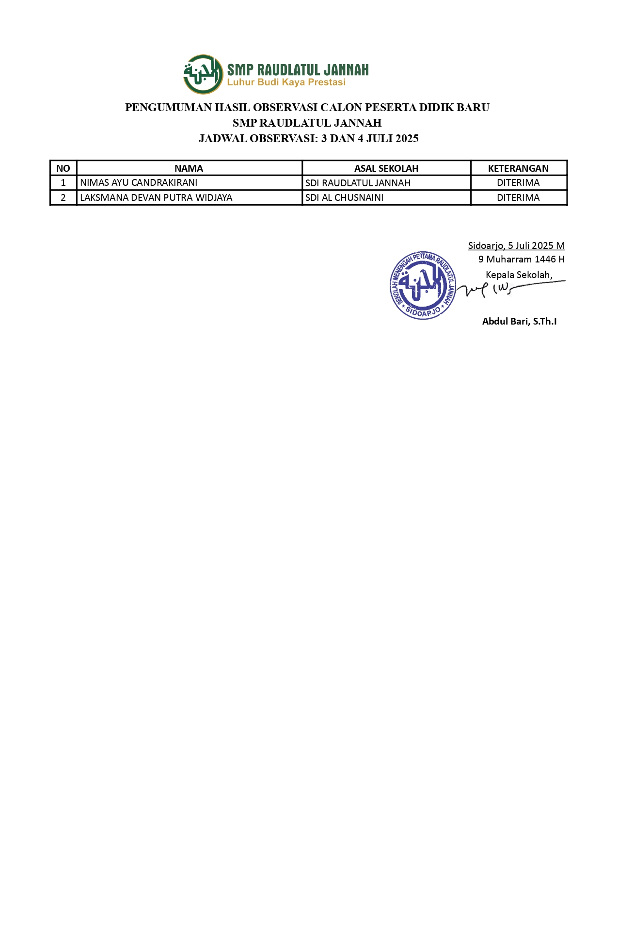1. Bagi calon siswa yang telah diterima wajib menyelesaikan biaya daftar ulang sampai 11 Juli 2025.