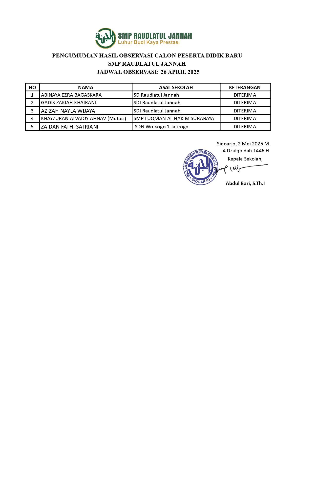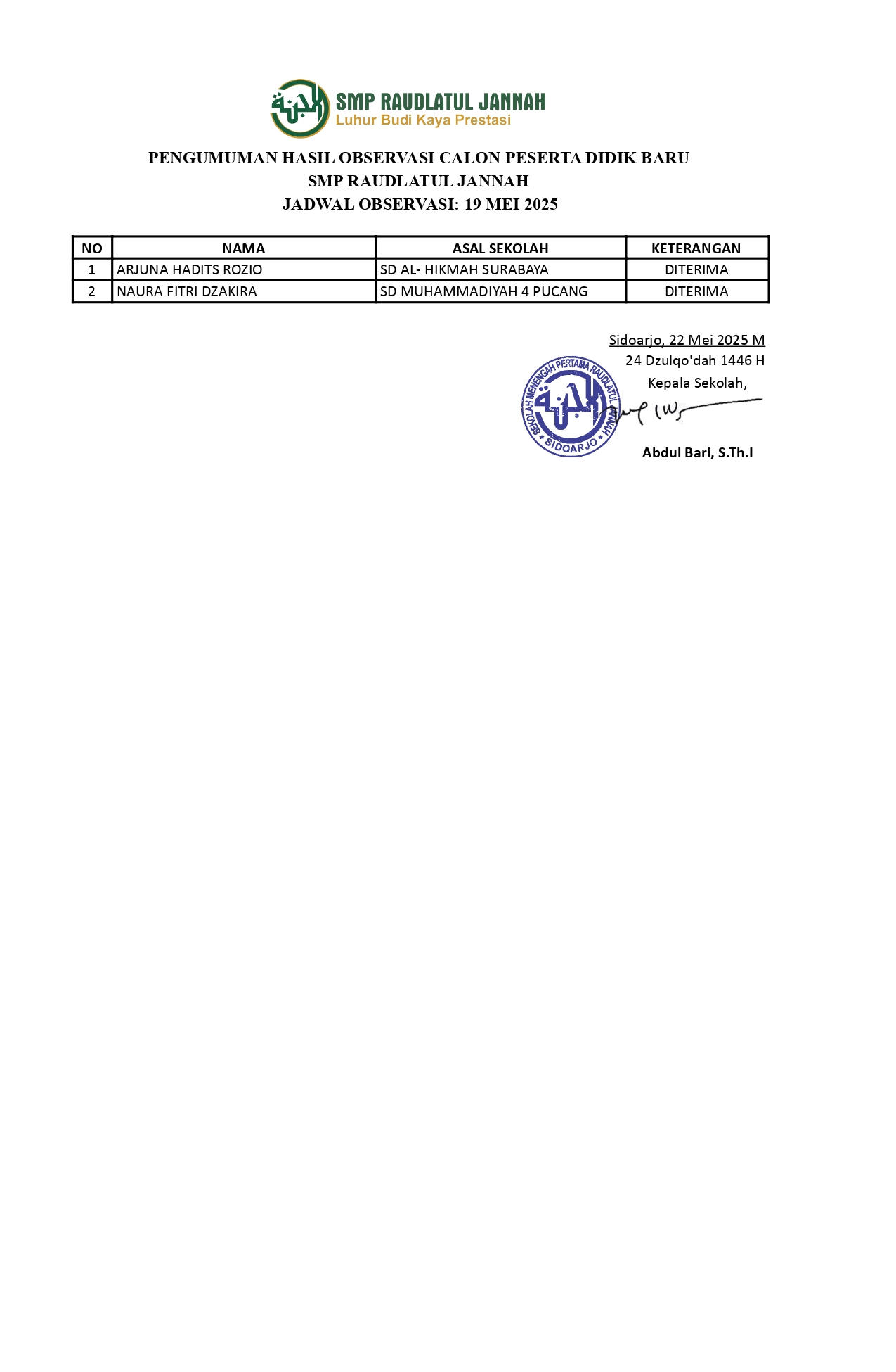 1. Bagi calon siswa yang telah diterima wajib menyelesaikan biaya daftar ulang sampai 17 Mei 2025.